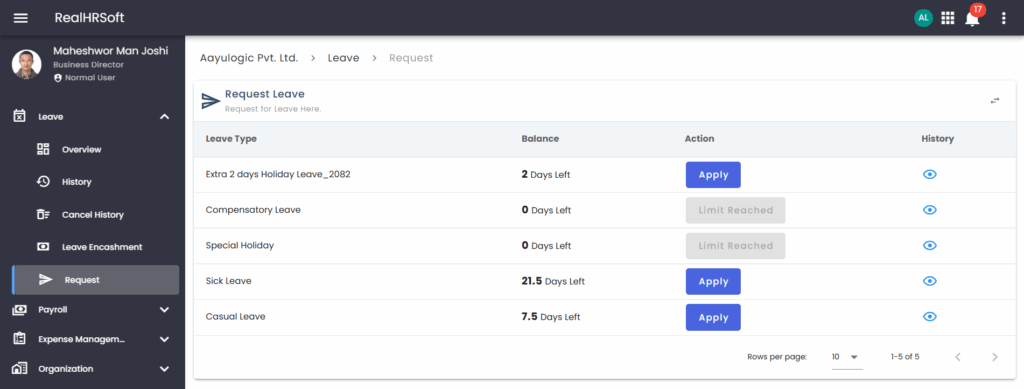 RealHRsoft’s Leave Management System features a flexible leave policy with customizable rules, offers real-time reports on absenteeism and leave, and supports leave approvals and historical reviews. It includes an intuitive dashboard and provides reports for clear insights into employee leave data.